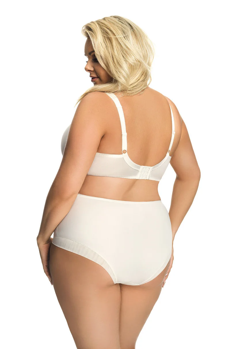 Senzační, velmi pohodlná měkká podprsenka v béžové barvě. Košíčky dobře sbírají poprsí, drží ho na místě a pěkně odhalují dekolt. Spodní části košíčků jsou vyrobeny ze stabilního matného úpletu. Horní část je vyrobena z průsvitného tylu, na kterém je našita krásná, jemná elastická krajka. Košíčky a střed podprsenky z hladšího úpletu a tylu. Košíčky jsou tvarované drátkem kolem prsou. Celkový efekt je, že prsa jsou dokonale shrnutá dovnitř, pozvednutá a udržují si krásný, zaoblený tvar.Široké boky jsou vyrobeny z pevného lycrového úpletu a navíc jsou vybaveny svislými kosticemi, které zajišťují, že podprsenka zůstane na svém místě. Velkou výhodou podprsenky jsou všitá rozšířená ramínka, která jsou pohodlná při nošení. Popruhy jsou nastavitelné, neodnímatelné, různé šířky v závislosti na velikosti. Zapínání: třípolohový háček, dvouřadý a třířadý v závislosti na velikosti. Složení: 90% polyamid, 7% elastan, 3% polyester