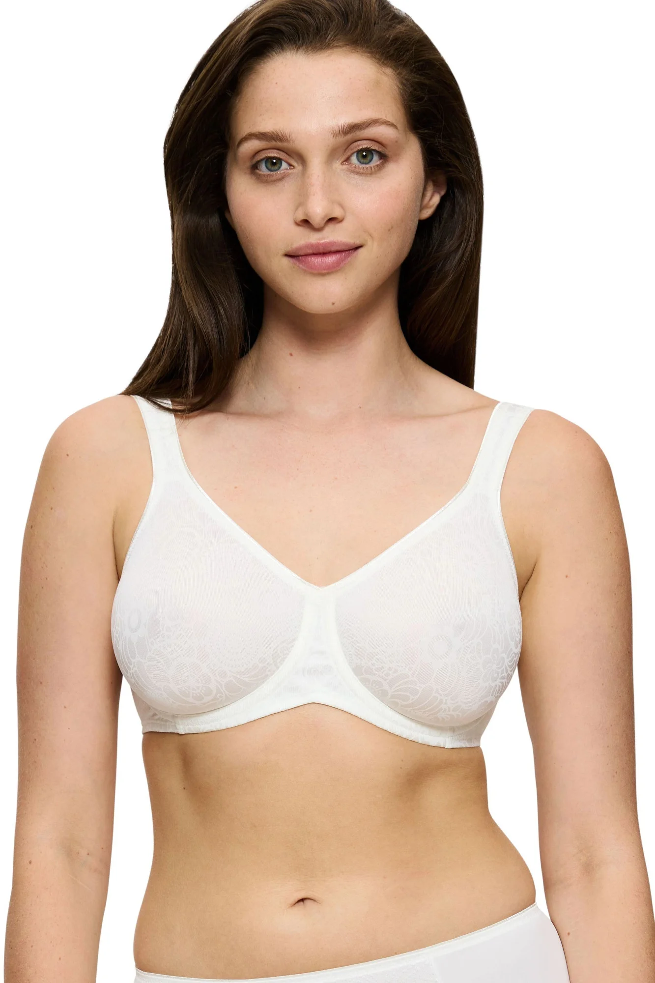 Dámská podprsenka Lovely minimizer WX white Triumph - krémová barva - z hladkého materiálu - s květovaným vzorem - opticky zmenšuje velikost prsou až o jednu velikost košíčku - s kosticemi - nastavitelná ramínka - zapínání vzaduMateriálové složení: 82% polyamid + 18% elastan