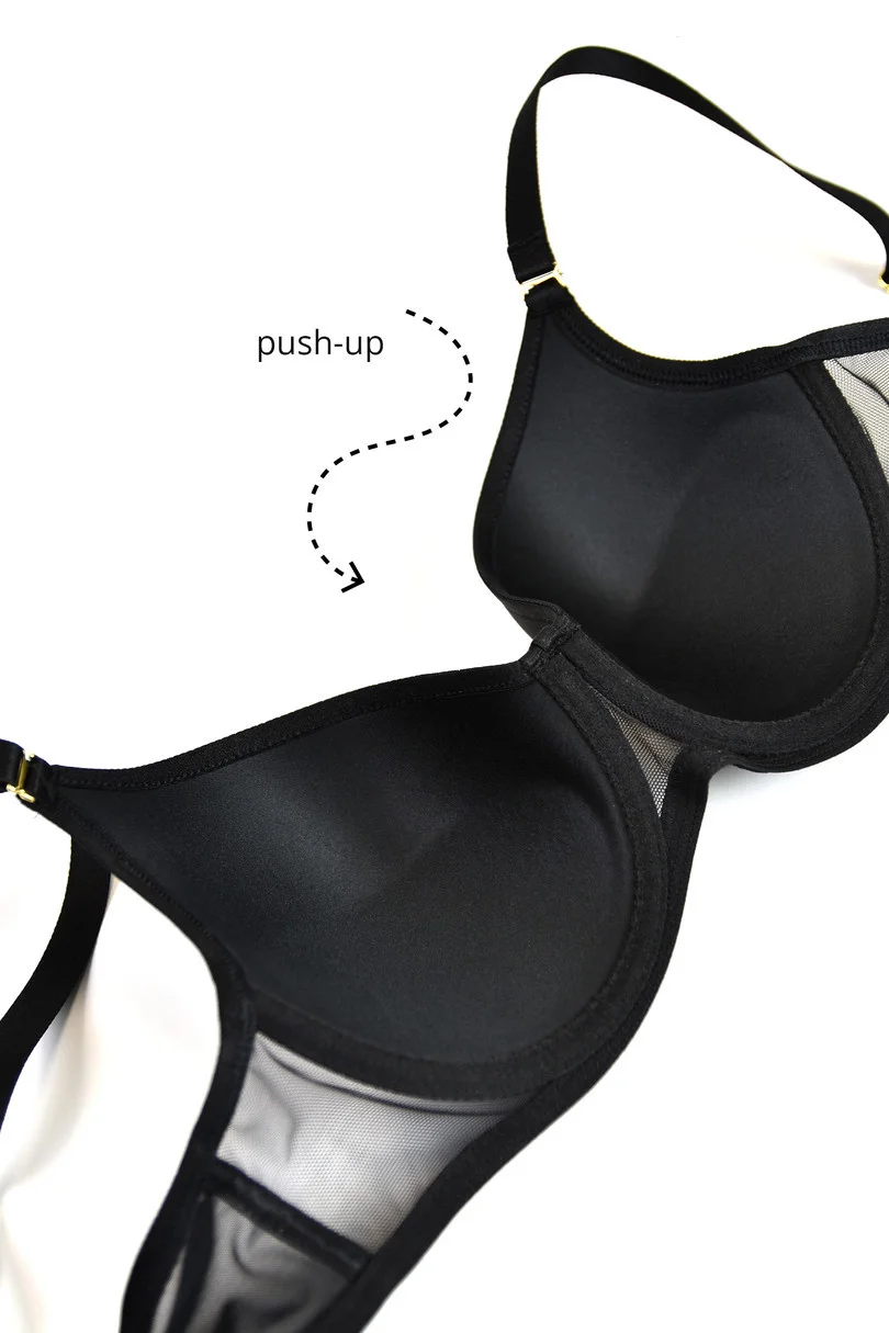 Hladká dámská podprsenka s tvarovanými košíčky a ramínky, která je možné odepnout. Košíčky jsou vyrobené z pěny a ve spodní části jsou lehce vyplněné, a proto poprsí lehce nadnáší směrem nahoru. Předností tohoto modelu je možnost odepnout ramínka. Mezi přednosti patří také široký výběr velikostí a rozměrů. Zlaté detaily dodávají modelu eleganci a zvýrazňují neobyčejný vzhled této podprsenky. Boky modelu jsou ušité ze stabilní síťovny. Model nemá boční kostice, což zvyšuje pocit pohodlí při nošení. Složení: 85 % polyamid, 10 % elastan, 5 % polyester.