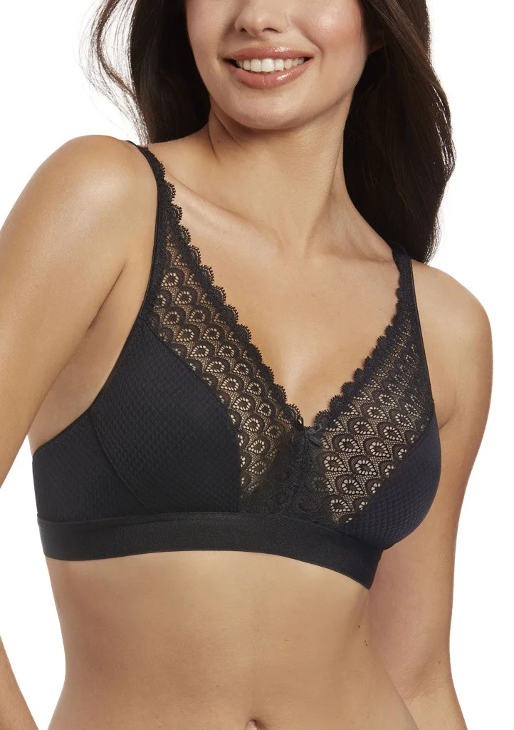 Dámská braletka od španělské značky Selene. Podprsenka má jemně strukturované nevyztužené košíčky bez kostic, které mají na hrudníku dekorovanou kraječku sahající až k ramenům. Pevně všitá ramínka jsou lehce délkově nastavitelná. Spodní část podprsenky tvoří jemná pružná guma. Zadní část ramínek je zdobena krajkou, která sahá ke spodní části podprsenky. Zapínání je na dva háčky a čtyři řady. Materiálové složení: 88% polyester, 12% elastan.