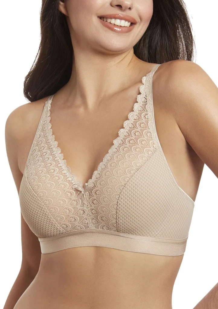 Dámská braletka od španělské značky Selene. Podprsenka má jemně strukturované nevyztužené košíčky bez kostic, které mají na hrudníku dekorovanou kraječku sahající až k ramenům. Pevně všitá ramínka jsou lehce délkově nastavitelná. Spodní část podprsenky tvoří jemná pružná guma. Zadní část ramínek je zdobena krajkou, která sahá ke spodní části podprsenky. Zapínání je na dva háčky a čtyři řady. Materiálové složení: 88% polyester, 12% elastan.