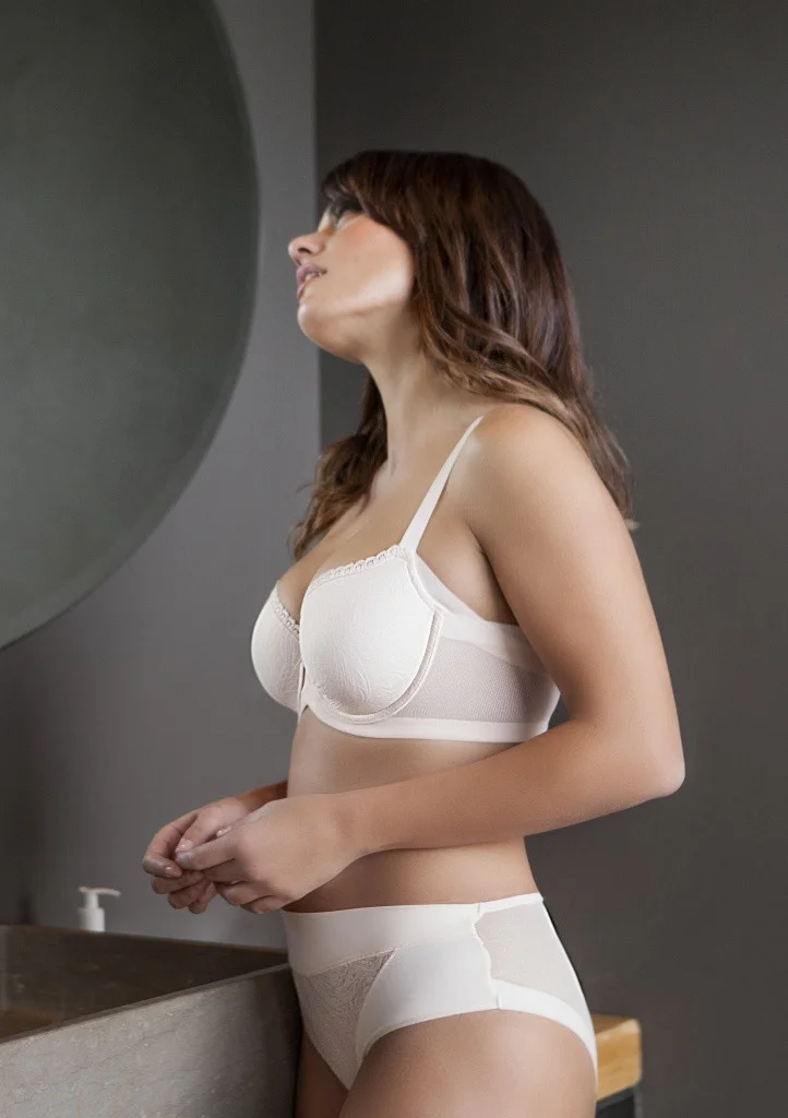 Dámská podprsenka Selene je vhodná pro běžné nošení i pod hladké oblečení. Podprsenka má vyšší střed a vyztužené košíčky s kosticemi, které jsou hladké s jemnou strukturou látky. Z vnější strany jsou lemovány tenkou přiléhavou krajkou. Mezi košíčky je ozdobná mašlička. Ramínka jsou pevně všitá, délkově nastavitelná, hladká. Pružný obvod je vyšší, tvořený dvojitým tylem s širší gumou v okrajích, přeložen do kříže pro maximální podporu. Podprsenka má zapínání v zadní části na tři háčky a čtyři pozice, zapínání je vyměkčeno. Materiálové složení: 45% polyamid, 44% polyester, 11% elastan.
