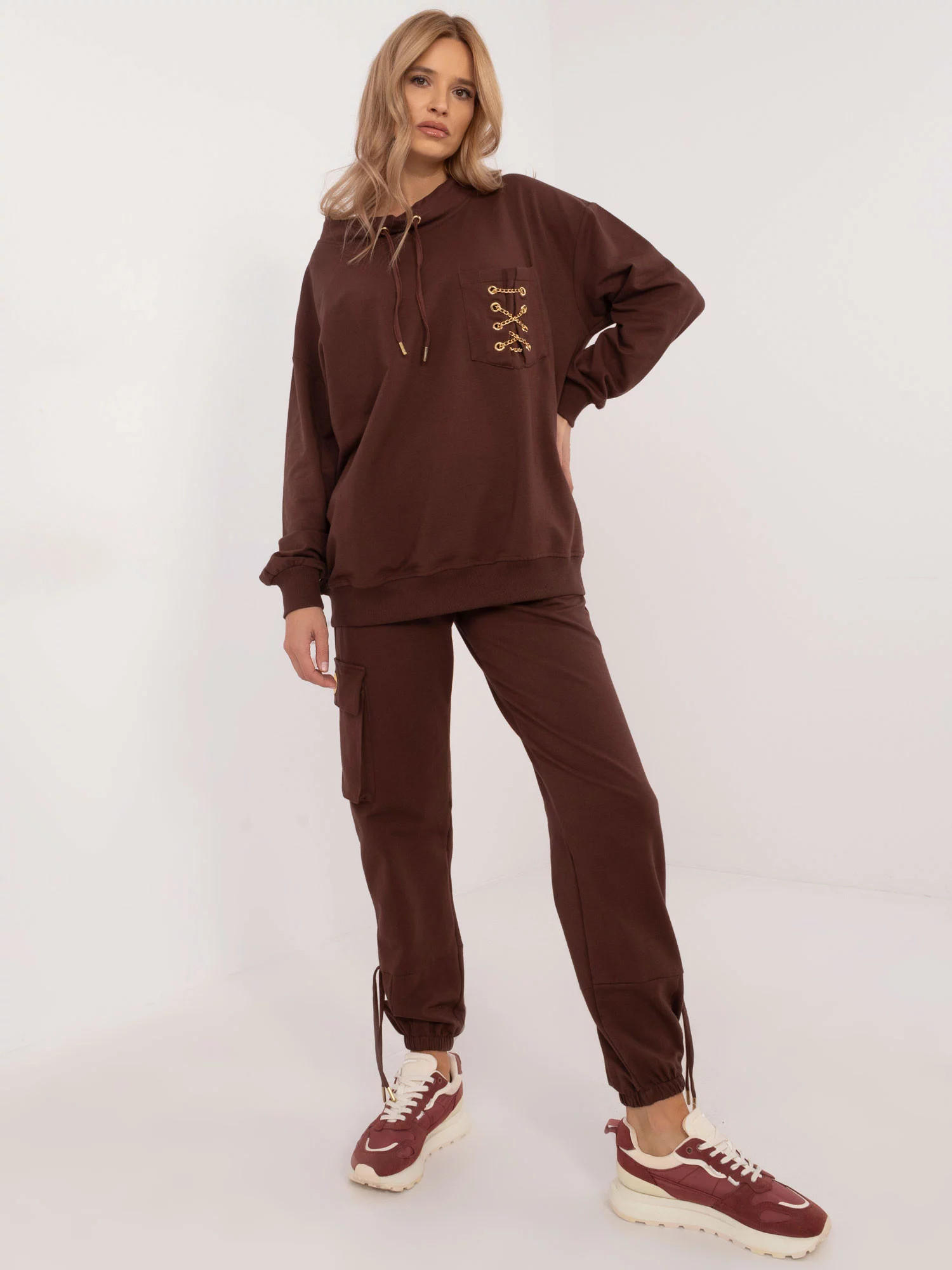 Dámský teplákový set se zlatými ozdobami na vrchním díle. Dlouhý rukáv, dlouhé kalhoty. Materiálové složení: 95% Bavlna, 5% Elastan Modelka má na sobě velikost S. Rozměry modelky: výška 175 cm, prsa 90 cm, pas 66 cm, boky 94 cm. Rozměry soupravy ve velikosti S měřené na plocho: šířka v podpaží - 60 cm, délka halenky - 68 cm, délka rukávů - 53 cm (od švu), šířka kalhot v pase - 34 cm, délka kalhot - 97 cm Velikost alt. Výška Obvod hrudníku Vnější délka rukávů Vnější délka rukávů S 36 160-164 82 59 49 M 38 162-172 86 61 51 L 40 164-174 91 63 53 XL 42 166-178 96 65 55
