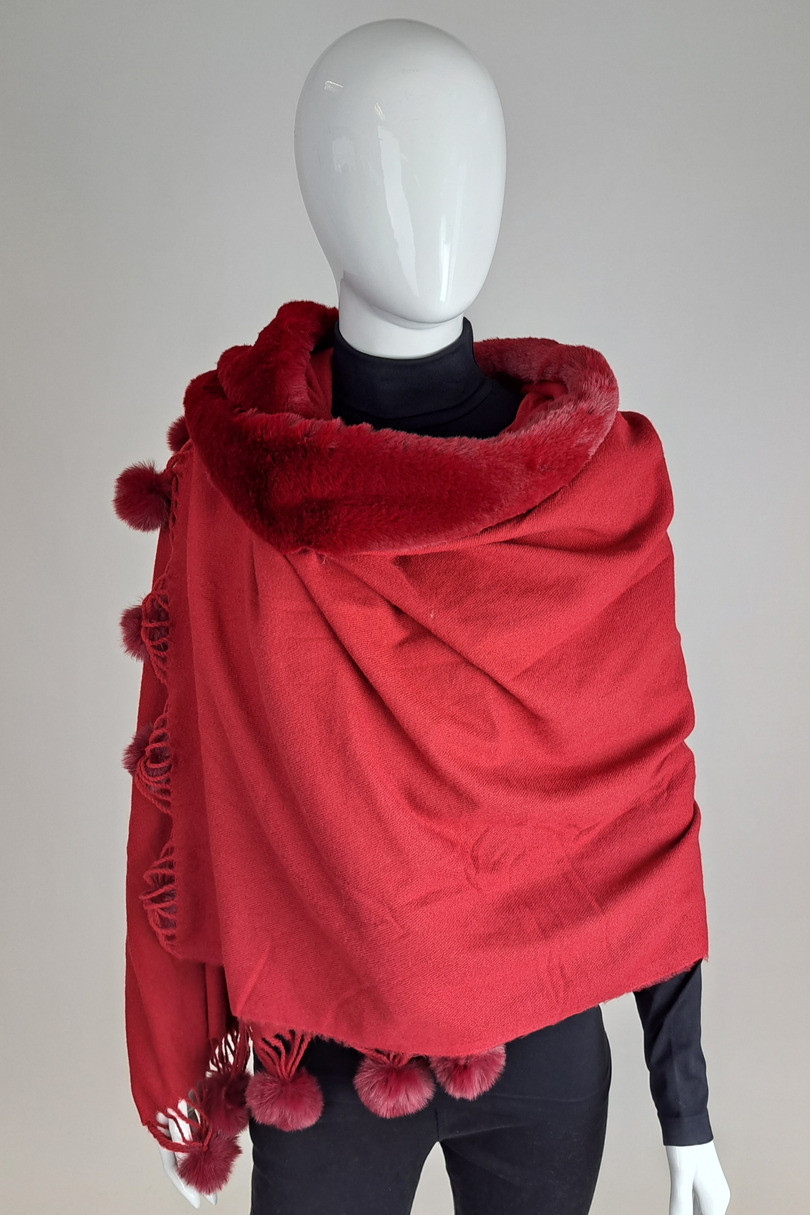 Krásná velká šála s přiloženým límcem z umělé kožešiny a bambulí. Mimořádně měkká a na dotek příjemná tkanina připomínající kašmír .