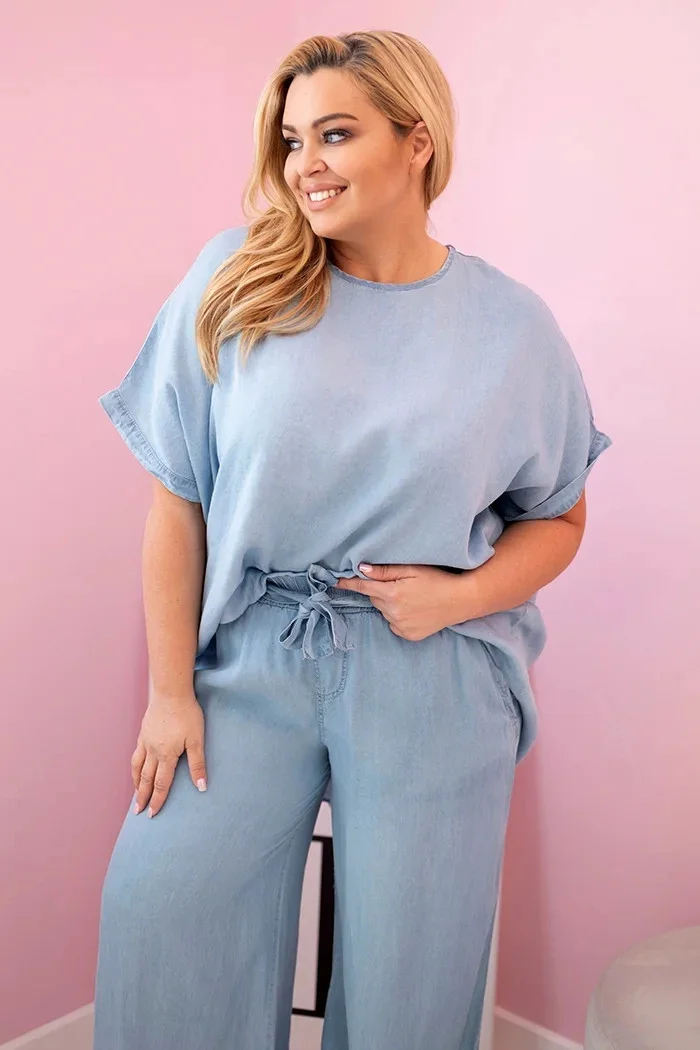 Stylová a pohodlná dámská Plus Size souprava z přírodního tencelu je ideální volbou na léto a každodenní outfity. Sada se skládá z volné halenky s asymetrickým střihem a kalhot se širokými nohavicemi a dekorativním vázáním v pase. Tkanina tencel je měkká, prodyšná a příjemná na dotek – zajišťuje pohodlí i v těch nejteplejších dnech. Volný střih a elastický pas zajišťují, že souprava perfektně sedí na postavě Plus Size, zvýrazňuje přednosti postavy a zakrývá nedostatky. Skvělá volba na každý den, dovolenou, do práce nebo na volné schůzky s přáteli. Model určený pro ženy nosící velikosti Plus Size – XXL, XXXL a větší. Model nosí velikost 4XL/5XL na denní bázi. Vlastnosti produktu: Střih: volný, oversize Styl: ležérní, městský, prázdninový Tkanina: 100% tencel – prodyšná, měkká a ekologická Halenka: asymetrická délka, kulatý výstřih, spadlé rukávy Kalhoty: široké nohavice, elastický pas s vázáním, boční kapsy Pohodlná sada ideální na léto Vyrobeno v Itálii Rozměry uvedené níže jsou měřeny naplocho +/- 1 cm Pro získání obvodu násobíme šířku krát 2 Složení materiálu: 100% Tencel Rozměry: Halenka: Šířka pod pažemi: 76 cm Celková délka: 71 cm (vpředu) / 88 cm (vzadu) Kalhoty: Šířka v pase: 39 cm (nenatažená) / 59 cm (natažená) Šířka v bocích: 62 cm Celková délka: 101 cm Délka od rozkroku: 70 cm