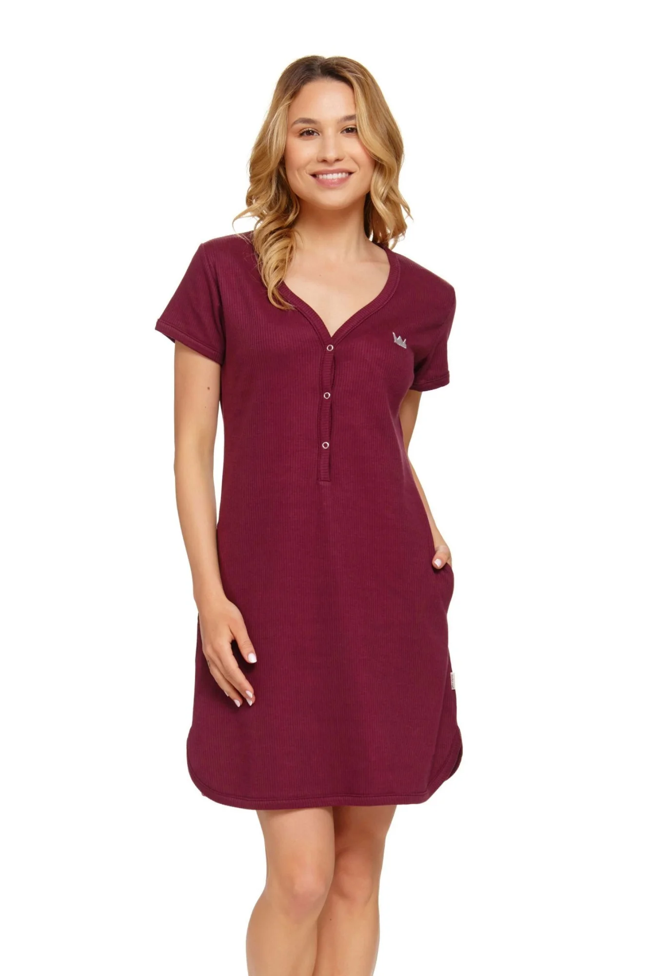 Dámská těhotenská košile 4115 wine Doctornap - bordó barva - z vysoce jakostní bavlny - na prsou zdobená nášivkou - výstřih se zapínáním na patentky - krátké rukávy - kapsy na bocích - ideální pro těhotné a kojící - hypoalergenní - certifikát OEKO-TEX Standart 100Materiálové složení: 100% bavlna