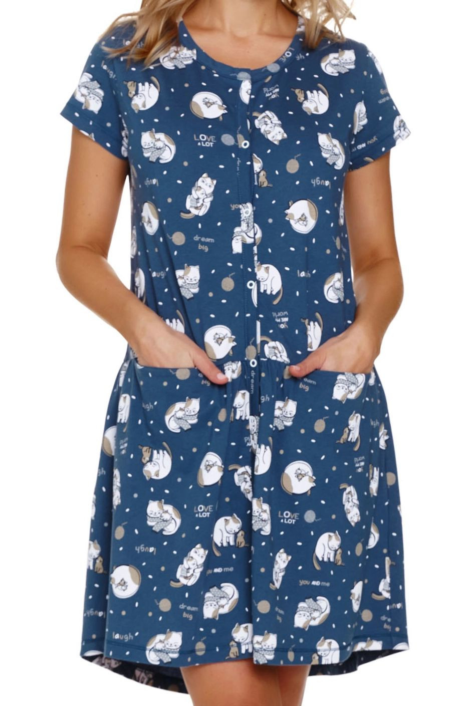 Dámská těhotenská košile 9444 Doctornap - světle modrá barva - z vysoce jakostní bavlny - s potiskem - zapínání na knoflíky po celé délce - krátké rukávy - praktické kapsy na bocích - spodní část zakončená volánem - ideální pro těhotné a kojící ženy - hypoalergenní, ekologická a bez škodlivých látek - certifikát OEKO-TEX Standard 100Materiálové složení: 100% bavlna