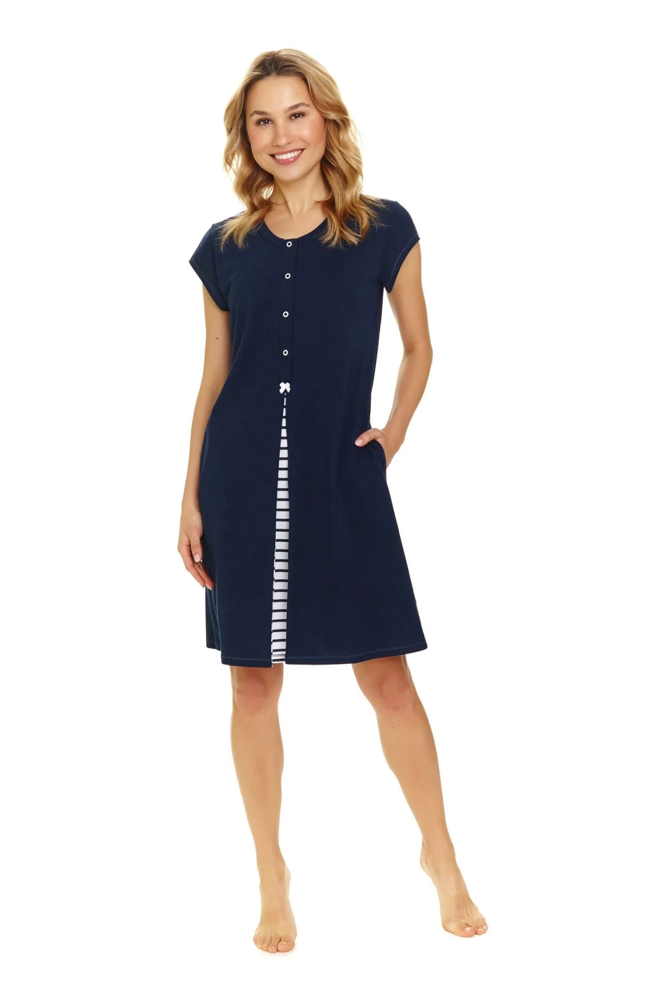 Dámská těhotenská košile 9703 Doctornap - tmavě modrá barva - z vysoce jakostní bavlny - krátké rukávy - zapínání na patentky - ozdobné řasení - na bocích kapsy - ideální pro těhotné a kojící - hypoalergenní - certifikát OEKO-TEX Standart 100Materiálové složení: 100% bavlna