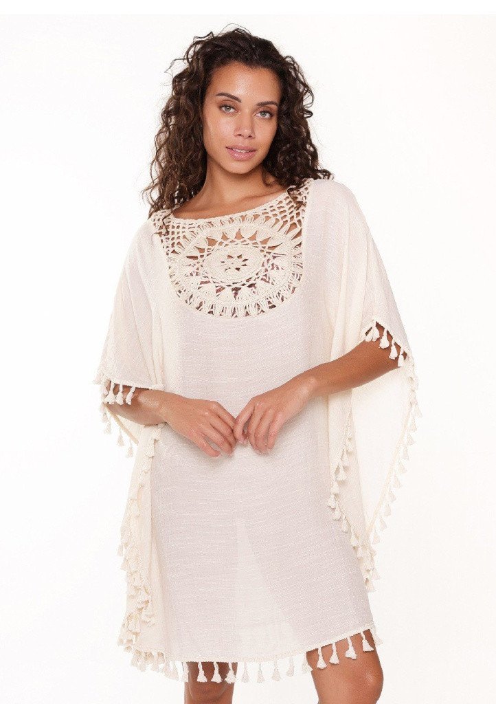 Dámská plážová tunika LingaDore. Tunika je z lehkého viskózového materiálu a je vhodná do horkých letních dnů jako přehoz na plavky. Je poloprůsvitná, v délce po kolena. Tunika má kulatý výstřih navazující na háčkovaný ornament. Po stranách jsou průstřihy na ruce, které vytvoří volné rukávy. Po celém obvodu je tunika lemovaná prošíváním s malými třásněmi. Materiálové složení: 100% viskóza.