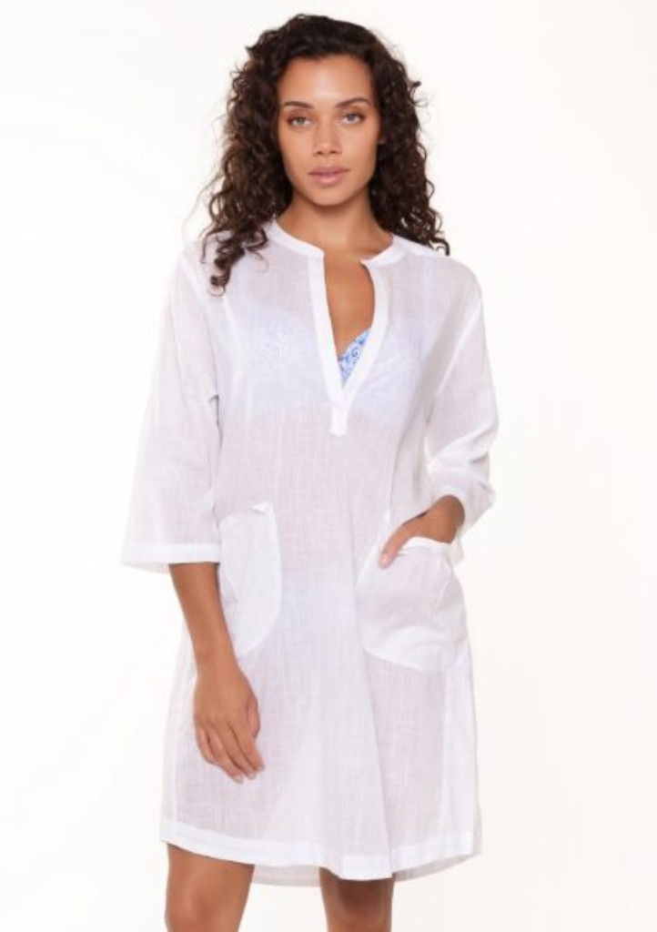Dámská tunika značky LingaDore. Tunika je poloprůsvitná, vhodná na pláž i k bazénu. Materiál je velmi prodyšný, ze 100% bavlny. Volná tunika má 3/4 rukávy s možností zahnutí a upevnění na knoflík. Tunika má délku po kolena a výstřih do tvaru V s prošívaným lemováním. V přední části jsou po stranách našity kapsy. Materiálové složení: 100% bavlna