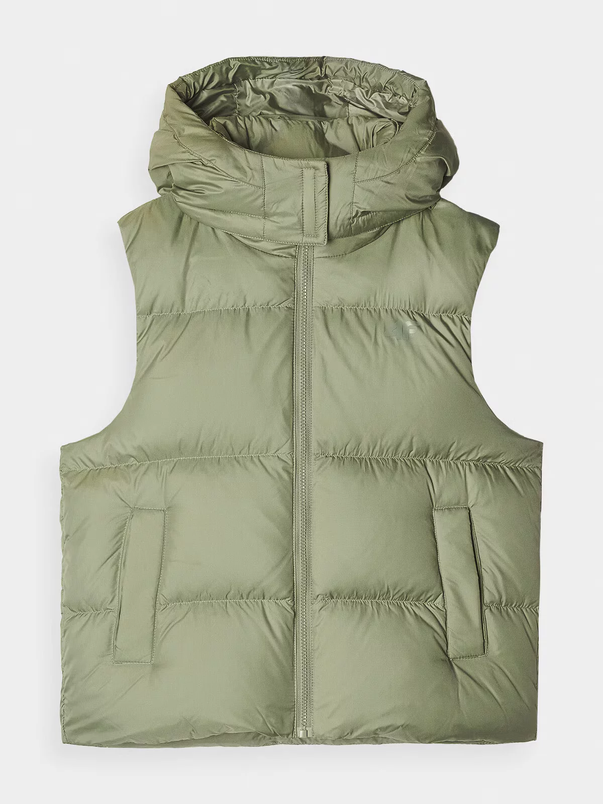 Dámská krátká péřová vesta se zvýšeným objemem a hmotností výplně je ideální volbou pro chladné a zimní dny při každodenních nebo sportovních aktivitách. Zaručuje velmi dobrou ochranu při nízkých teplotách a zároveň plný komfort během různých povětrnostních podmínek. Vesta má klasické horizontální prošívání, které se skládá z rovnoběžných pruhů vedoucích napříč bundou. Tento druh prošívání zajišťuje dobrou tepelnou izolaci a dostatečnou kompresi bundy. Má střih oversize, který volně sedí na postavě, poskytuje dostatek volnosti a standardní délku sahající až k bokům.