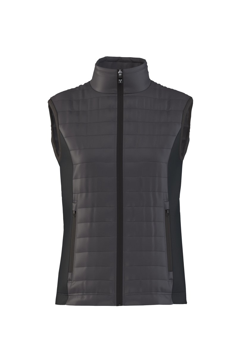 Dámská zateplená vesta, soft-shellové boky, zapínání na plastový zip s kovovým jezdcem „semi-auto lock“ a přizpůsobeným taháčkem, dvě boční kapsy na zip.
