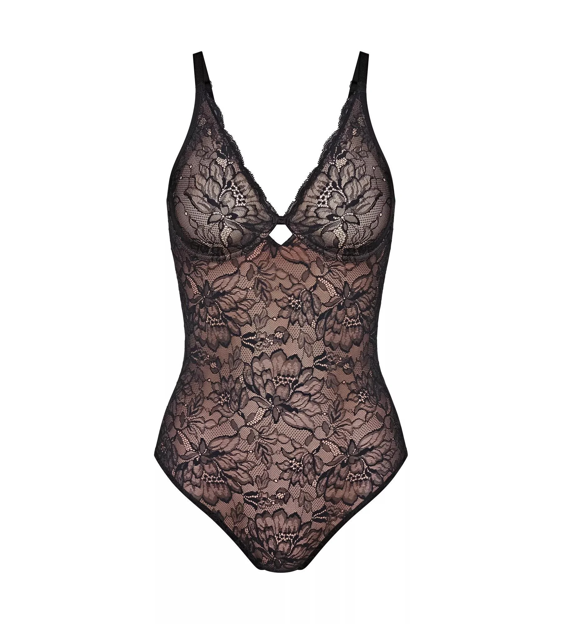 Dámské body v černé barvě - vyrobeno výhradně z elastické krajky - přední část a košíčky jsou podšité béžovou síťovinou - měkké košíčky - neodnímatelná, nastavitelná ramínka - ozdobná ramínka - pohodlné zapínání na háčky v rozkroku - bavlněný klínek pro pohodlí a komfort Materiál: 73% Polyamid, 27% Elastan