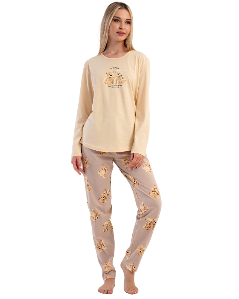 Dámské bavlněné dlouhé pyžamo Monika. Roztomilé dámské pyžamo se skládá z trika s dlouhým rukávem a dlouhých kalhot. Triko s kulatým výstřihem je na hrudi zdobeno obrázkem plyšových medvědů. Tento motiv se opakuje i na kalhotách, které mají v pase gumu a šňůrku na stažení, nemají kapsy. Použitý bavlněný materiál je poddajný a příjemný na dotek. Materiál 100% bavlna