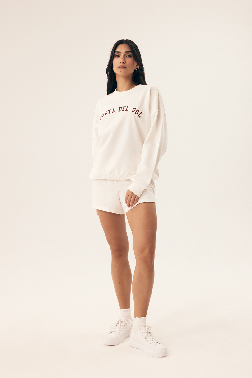 Bawełniana piżama damska idealna również jako homewear, sportowy fason, bluza z długim rękawem, dekolt okrągły, z przodu ozdobny haftowany napis, do kompletu krótkie spodenki, mankiety, dół koszulki i pas wykończone ściągac. Skład: 100% Wiskoza