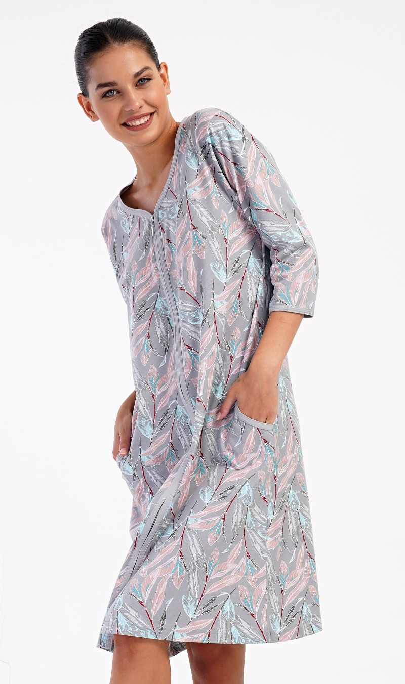 Dámské bavlněné domácí šaty s tříčtvrtečním rukávem Kika. Pohodlné rozepínací šaty v příjemné délce pod kolena využijete téměř při všech volnočasových aktivitách. Mají praktické kapsy a zapínání na zip. Šedé šaty jsou potištěny větvičkami a listy v mentolové a lososové barvě. Použitý bavlněný materiál je příjemný a poddajný na dotek. Pokyny pro údržbu: - 100% bavlna - lze prát v pračce při teplotě do 30° - nesušit v sušičce - žehlit z rubu do 110° - nepoužívat bělící prostředky - nečistit chemicky Míry naměřené na výrobku: 4050280280 Kika 1XL 2XL 3XL 4XL obvod hrudníku 120 126 128 130 obvod boky 126 138 140 142 délka 99 99 99 99