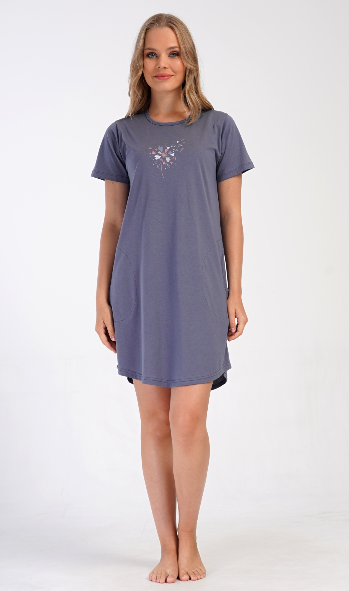 Dámské bavlněné domácí šaty s krátkým rukávem Pampeliška. Domácí jednobarevné šaty s kulatým výstřihem a kapsami zdobí na hrudi obrázek rozfoukané pampelišky. Použitý bavlněný materiál je příjemný a poddajný na dotek. Šaty jsou pohodlné, využijete je téměř při všech volnočasových aktivitách. Jsou vhodné na spaní i na denní nošení.