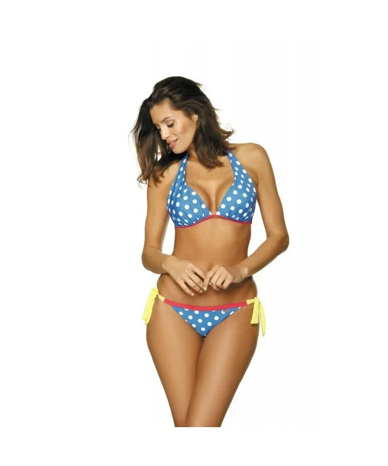 Módní dvoudílné plavky, které oceníte jak při plavání, tak i při opalování. Podprsenka modelu se zavazuje za krkem, má vytvarované košíčky a vzadu pohodlné zapínání na klip. Model má svislé kostice. Vykrojené kalhotky se na bocích zavazují. Plavky zdobí vzor kontrastních puntíků. Model je vyrobený z velmi kvalitní italské látky Carvico Tesutti. Plavky rychle usychají a odolávají působení slunečních paprsků (neztrácí barvu a tvar). Složení: 80 % polyamid, 20 % elastan.