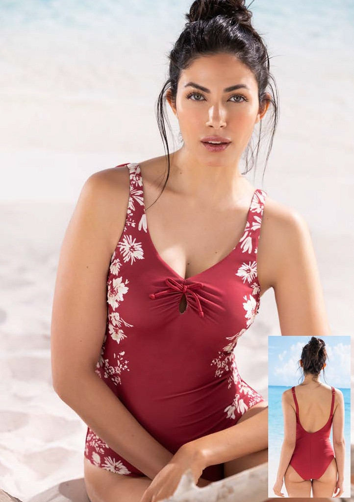 Dámské jednodílné plavky italské značky Siélei. Plavky mají všitou podprsenku, která má vyztužené košíčky. Pod košíčky je zpevňující pásek, aby prsa dobře držela. Plavky mají délkově nastavitelná ramínka. Plavky jsou celé podšité rychleschnoucí látkou. Plavky jsou v hezké bordové barvě a na bocích jsou světlé květy, který dělají zajímavý kontrast plavkám. Materiálové složení: 86% polyamid, 14% elastan