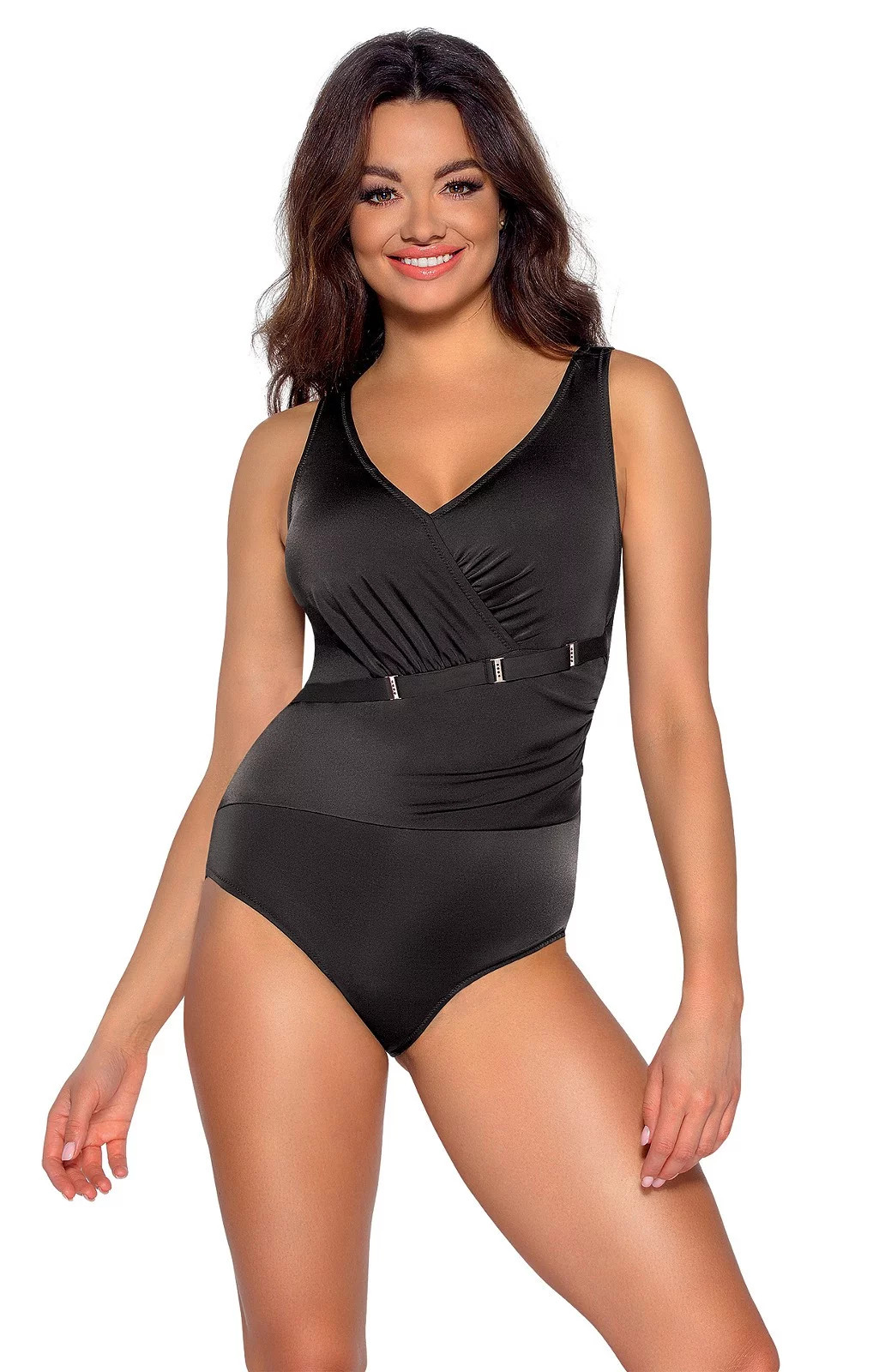 Jednodílné plavky - pevné mikrovlákno - mírně polstrované košíčky - výrazné záhyby na poprsí - bederní pás s bižuterními přezkami, nastavitelný - hluboce vykrojená záda Složení: 80% polyamid, 20% elastan