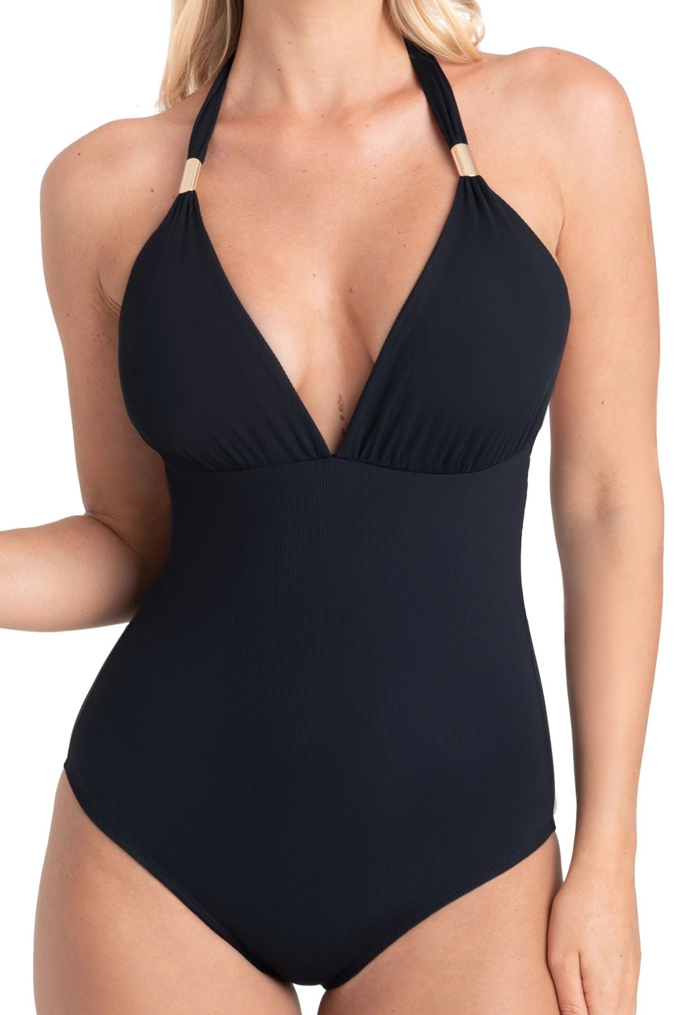 Dámské jednodílné plavky Venus I140 Samanta - černá barva - z kvalitního španělského mikrovlákna - košíčky podprsenky jsou výškově nastavitelné - zapínání a nastavovací prvky v barvě žlutého zlata - zavazování za krkem - žebrovaný úplet opticky zeštíhlí Vaši siluetu - certifikát Oeko-Tex STANDARD 100®Materiálové složení: 88% polyamid + 12% elastan