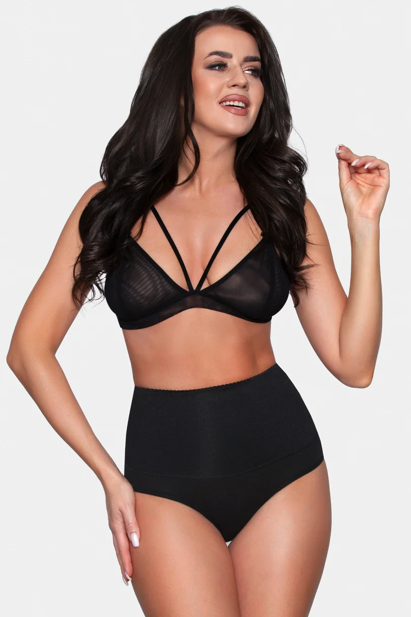 Dámské tvarovací kalhotky s vyšším pasem. Polyamidová látka (87%) s elastanem tvoří pevný pás modelující břicho a boky. Spodní část kalhotek je z bavlny a elastanu.