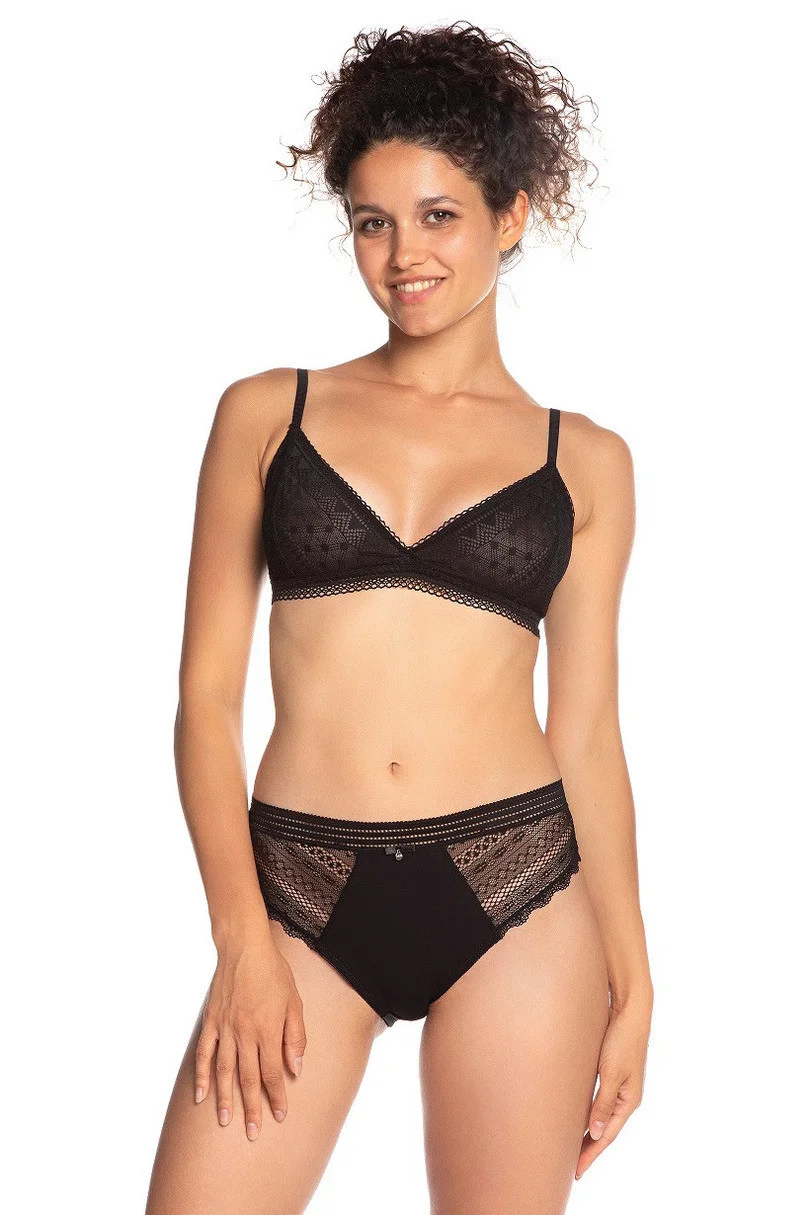 Dámské bavlněné kalhotky se střihem typu "bikiny". Přední díl kalhotek je vyrobený z hladké bavlny. Boky a zadní díl modelu jsou ušité z efektní krajky. V pase modelu je širší ažurová guma. Kalhotky jsou balené po dvou kusech. Složení: 95 % bavlna, 5 % elastan.