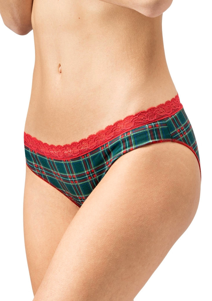 Dámské kalhotky Cotonella. Kalhotky mají klasický střih, jsou vyrobeny z jemného materiálu s vánočním designem a v pase mají červenou pružnou krajku. . Materiálové složení: 81% bavlna, 12% polyamid, 7% elastan.