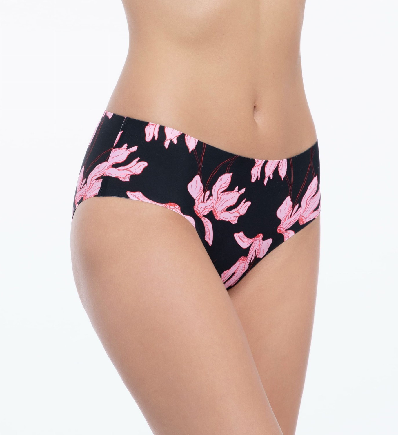 Dámské kalhotky s klasickým střihem. Kalhotky jsou ozdobené květinovým potiskem. Model je bezešvý, je střižený laserem a nerýsuje se ani pod vypasovaným oblečením. Složení: 89 % polyamid, 10 % elastan, 1 % bavlna.