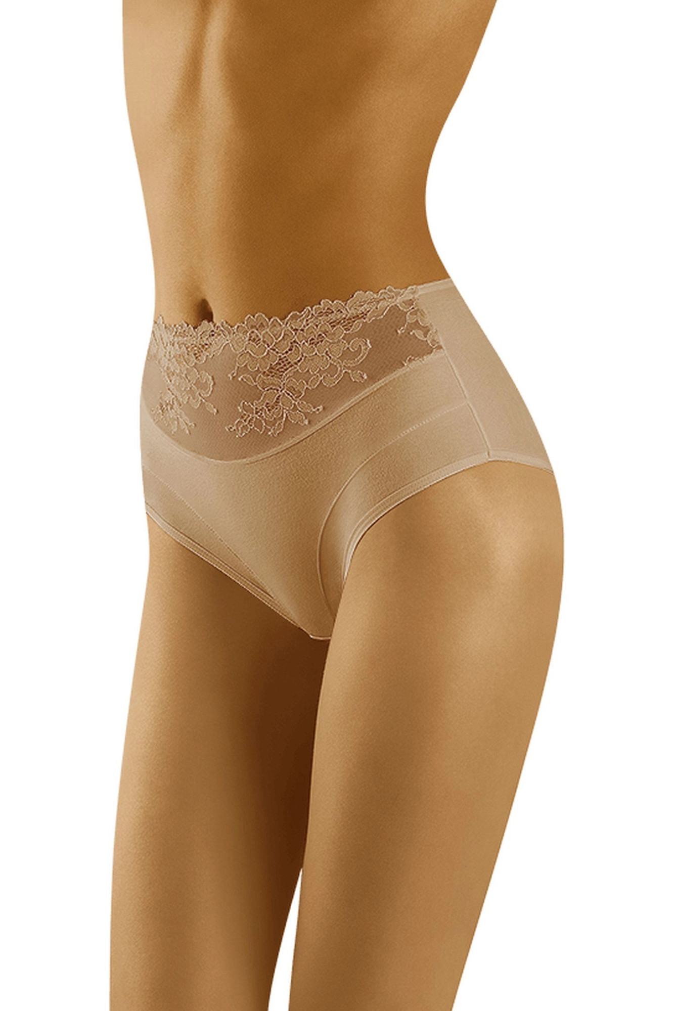 Dámské kalhotky Eco-HI Wol-bar - béžová barva - z vysoce jakostní bavlny - vyšší pas - pas zdobený krajskou s květinovým motivem - zadní část je hladkáMateriálové složení: 90% bavlna + 7% elastan + 3% polyamid