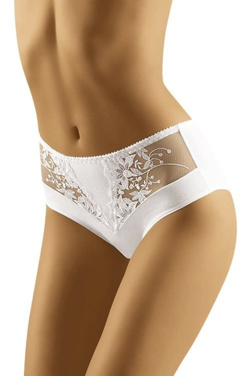 Plně pletené spodní díly z žebrovaného úpletu. Přední díl bohatě zdobený květinovou krajkou.