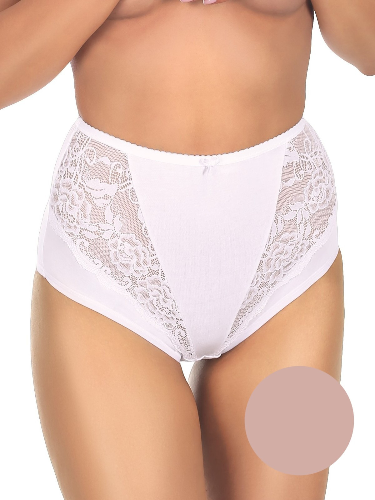 Bavlněné dámské kalhotky. Kalhotky mají vysoký střih, vysokou linii pasu a plné boky. Efektní přední díl zdobí krajkové vsadky s květinovým motivem. Složení: 95 % bavlna, 5 % elastan.