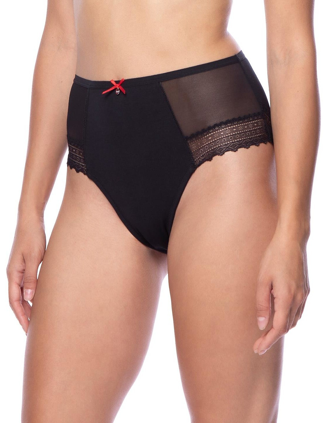 Dámské kalhotky midi střihu - vysoká linie pasu, zvýrazněné boky - tylové a krajkové vsadky na přední straně - plochý elastický pas se saténovou mašlí a visačkou s logem LAMA - baleno po dvou kusech - jedny černé, druhé s květy   Složení: 95 % bavlna, 5 % elastan