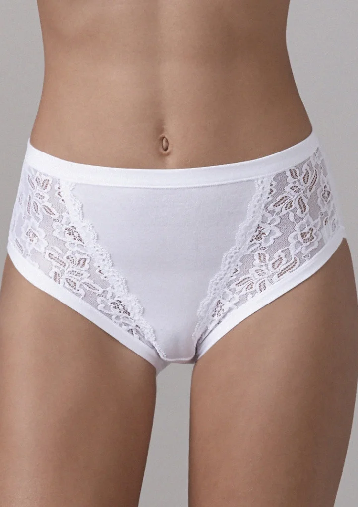 Dámské kalhotky vyššího střihu od značky Lovelygirl. Kalhotky jsou vyrobeny z bavlny a elastanu. Přední část je kombinována s elastickou krajkou s jemným květinovým vzorem. V balení jsou dvoje bílé kalhotky a jedny v červné barvě. Materiálové složení: 90% bavlna, 10% elastan