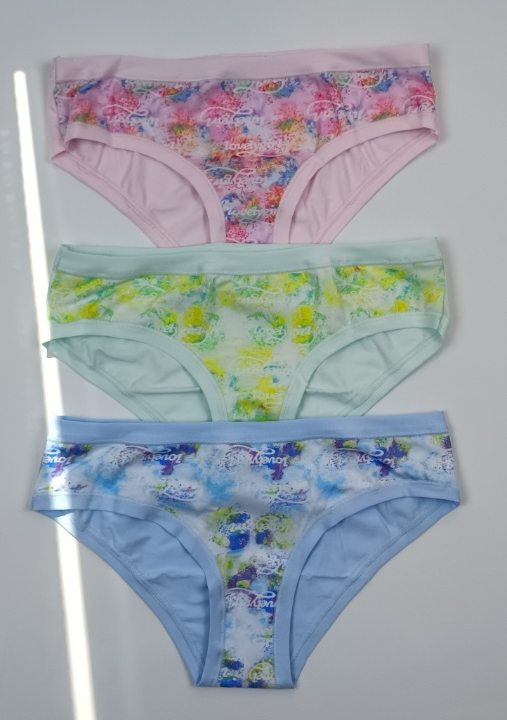 Dámské bavlněné kalhotky od značky Lovelygirl. Klasické kalhotky jsou velmi příjemné na dotek, hladké a vpředu mají jemný barevný potisk. Po obvodu je pohodlný pružný pás a do vnitřního dílu je všitý bavlněný klínek pro komfortní nošení. Barva u kalhotek Vám bude vybrána náhodně nebo můžete barvu napsat do poznámky. Uvedená cena je za jeden kus. Jsou baleny v krabičce. Materiálové složení: 90% bavlna, 10% elastan.