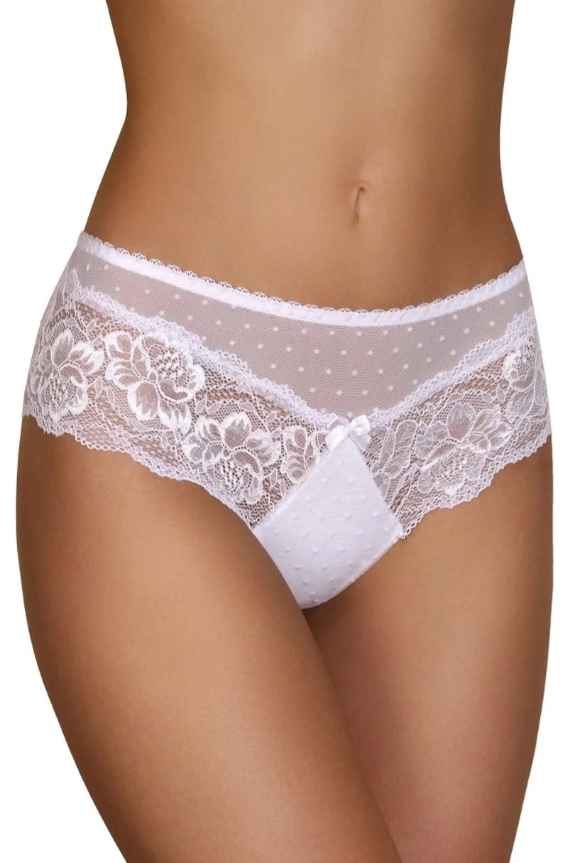 Dámské kalhotky, které jsou vyrobené z jemné síťoviny a krajky. Zadní díl kalhotek je ušitý z hladkého mikrovlákna a je střižený laserem. Složení: 85 % polyamid, 15 % elastan.