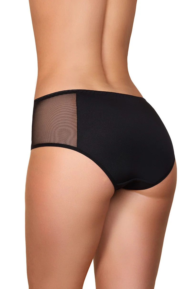 Klasické dámské kalhotky, kombinace síťoviny a mikrovlákna. Přední strana zdobená výraznou výšivkou hladká zadní strana. Složení: 85% polyamid, 15% elastan .