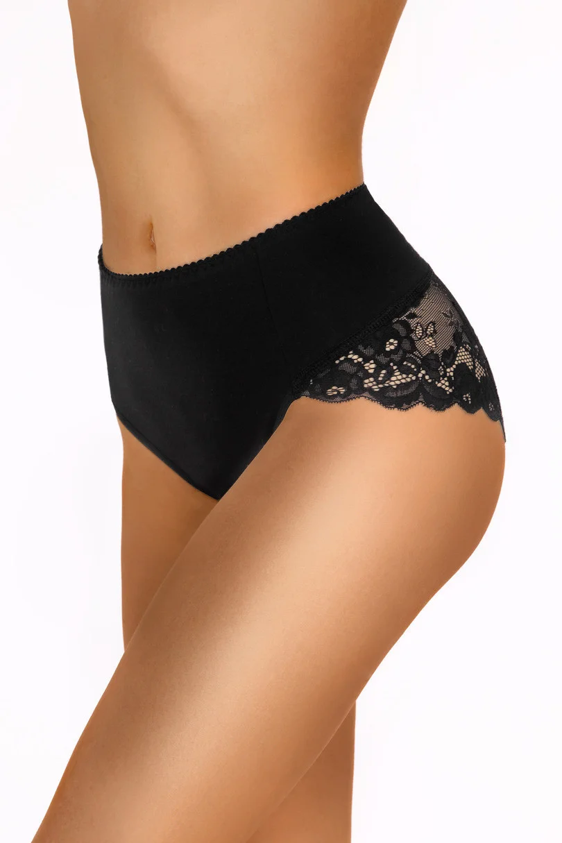 Krajkové dámské kalhotky s vysokým pasem. Odzobené saténovými mašličkami. Pozadí krajkové. Složení: 85% polyamid, 15% elastan.