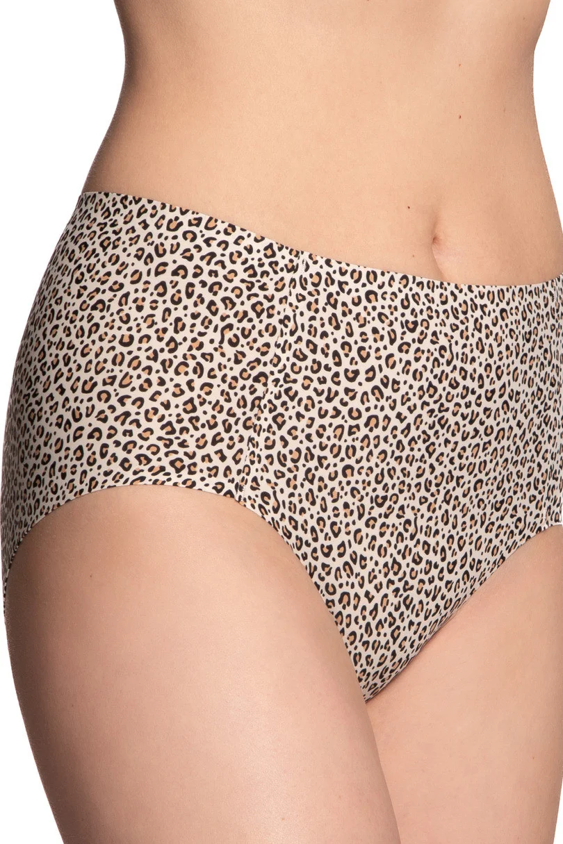 Stylové a pohodlné dámské kalhotky s bezešvým zakončením, zdobené módním leopardím vzorem. Jsou vyrobené z měkké, elastické tkaniny a poskytují dokonalé přizpůsobení a pohodlí po celý den. Ideální pro nošení pod vypasované oblečení – na pokožce nevyčnívají, zaručují jemný a hladký efekt. Jsou vhodné jak pro každodenní nošení, tak pro zvláštní příležitosti, poskytují pohodlí a styl. Složení: 90 % polyamid, 10 % elastan.