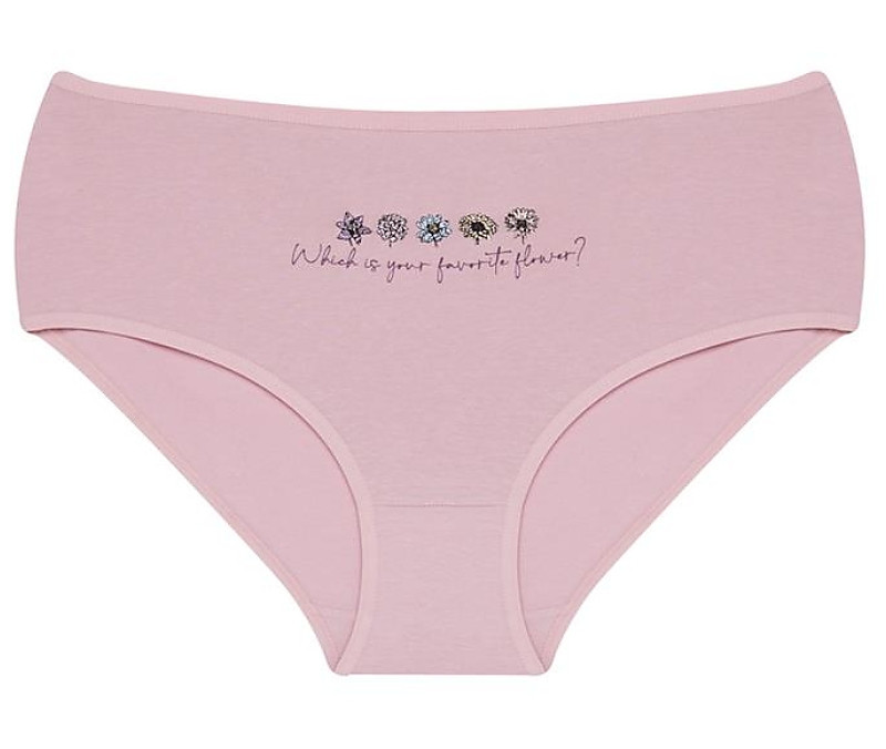 Dámske nohavičky Mirka. Dámske nohavičky klasického strihu. Nohavičky sú ozdobené potlačou kvetín a drobným nápisom. Použitý materiál je príjemný a poddajný na dotyk.