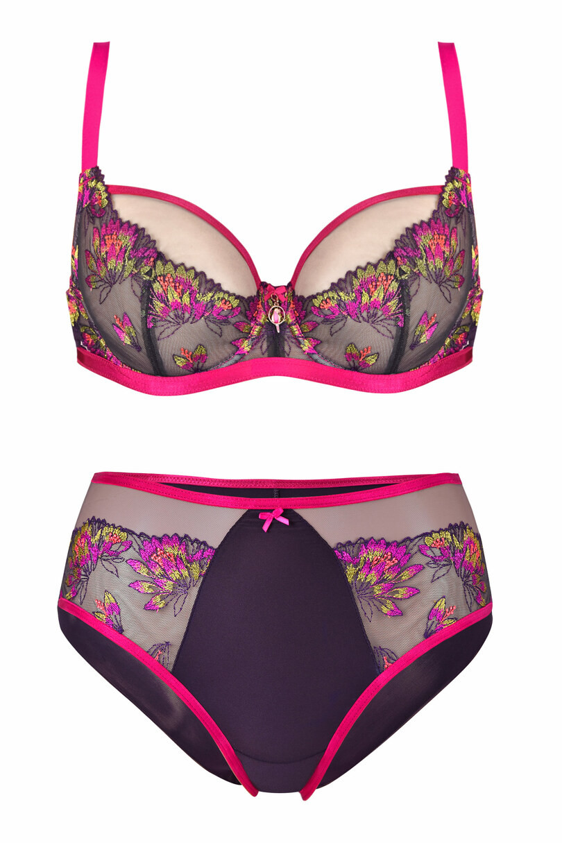 Plné kalhotky Přední díl je vyšívaný krásnou výšivkou, zadní díl je z fialového tylu s kosticemi, okraje jsou zakončené amarantovým lamelem Složení materiálu: 78 % polyamid, 12 % elastan, 5 % polyester, 5 % bavlna. .