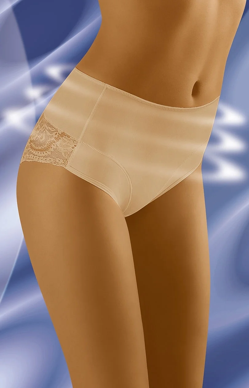 Dámské kalhotky z mikrovlákna, zadní část dekoruje ažurová krajka s květinovým motivem, horní linie hladká. Vysoké, se širší boční části. Složení: 58% polyamid, 42% elastan.