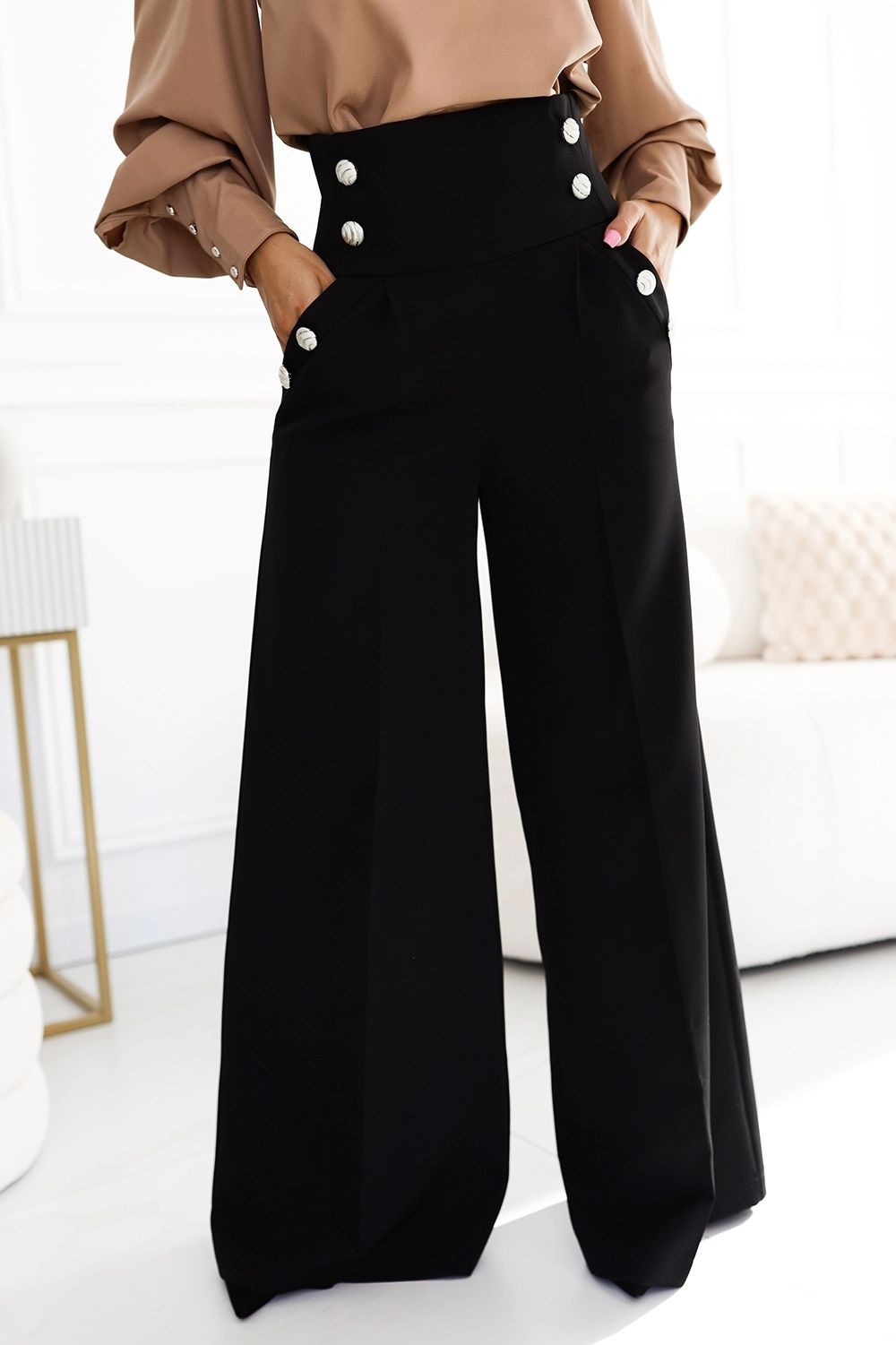 Dámské kalhoty 496-2 NUMOCO - černá barva - z hladkého černého matného materiálu - široké nohavice s vysokým pasem - zlaté knoflíky - praktické kapsyMateriálové složení: 95% polyester + 5% elastan
