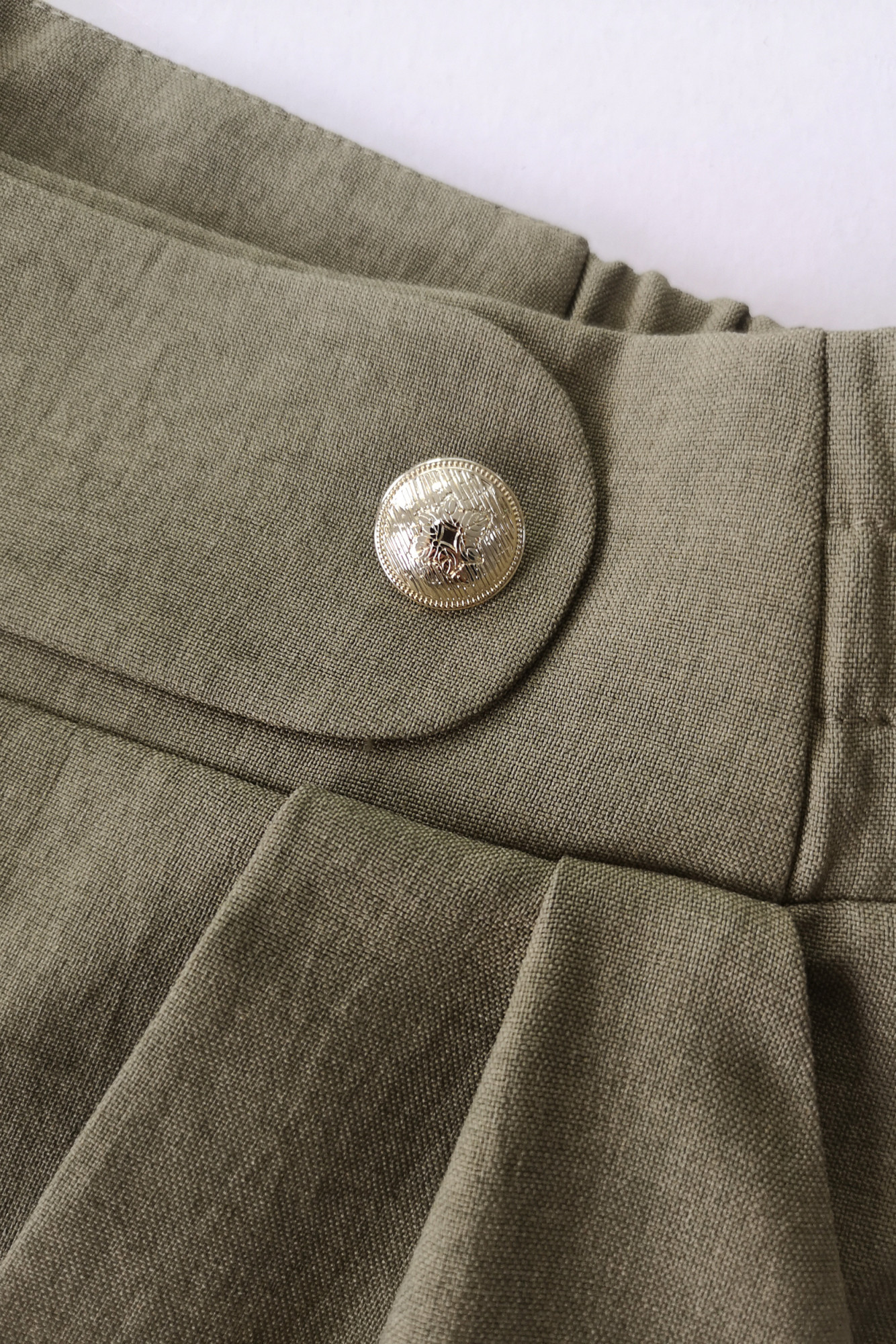 Design těchto lehkých kalhot si zamilujete - široké nohavice se záhyby, částečně elastický pas a ozdobné zlaté knoflíky vpředu. Materiál složení: 100% polyester KategorieFC: Dámské oblečení | Kalhoty Pohlaví: Ženské Kolekce: Jaro/Léto/Podzim/Zima Pokyny pro péči: Pokyny pro praní: 30°C Prát v pračce Barva: Olivová