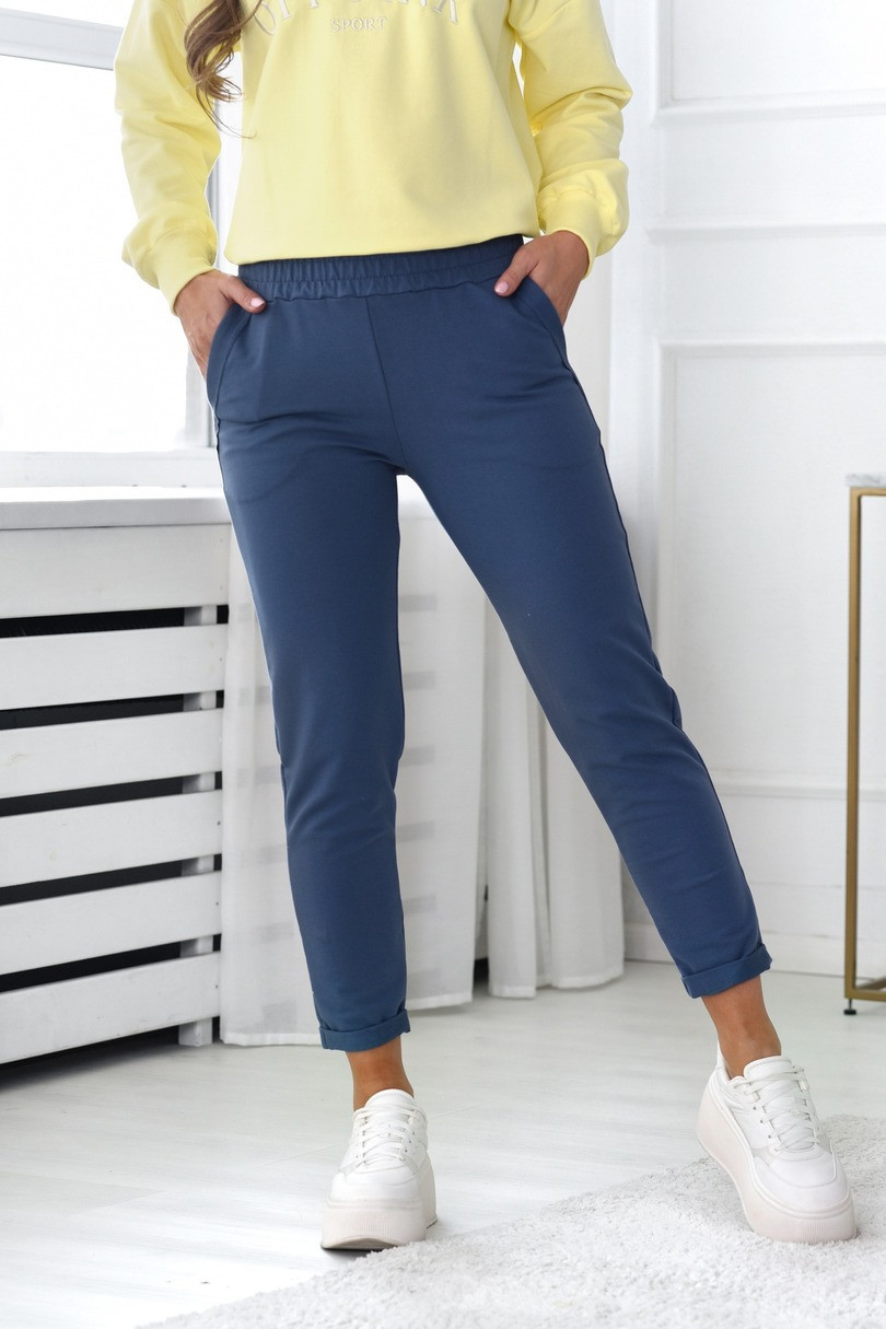 Dámské teplákové kalhoty. Kalhoty mají nohavice v 7/8 délce. Spodní okraj nohavic je ohrnutý. Ve přední části modelu jsou dvě kapsy. Zadní díl kalhot je hladký. Složení: 95 % bavlna, 5 % elastan.