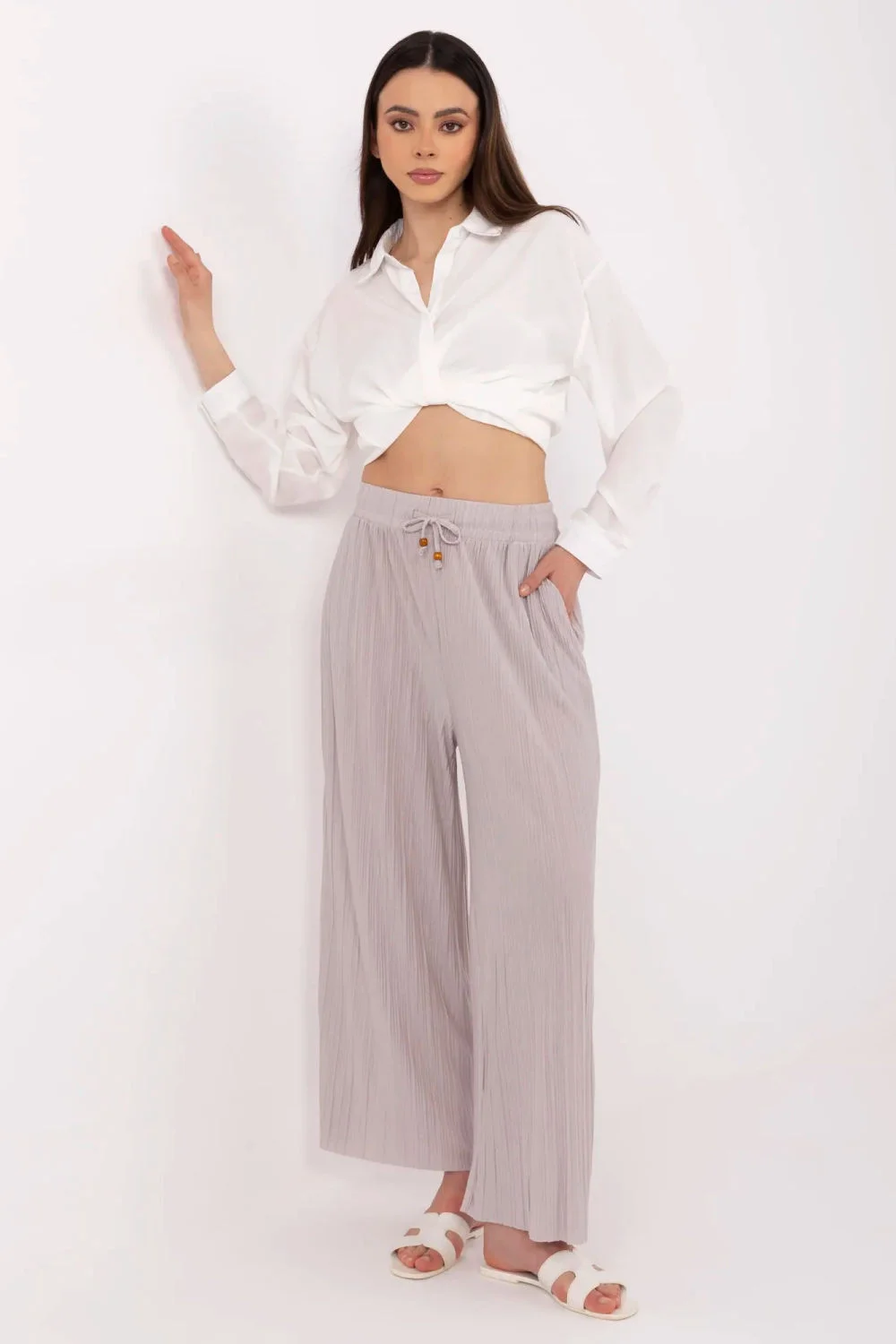 Tyto casualové dámské kalhoty jsou kombinací pohodlí a moderního stylu. Vyrobené z měkké směsi viskózy a polyesteru, skvěle padnou na postavě, poskytují pohodlí po celý den. Hladký materiál a klasický střih zaručují, že kalhoty budou skvěle vypadat v každodenních stylizacích - jak do práce, tak na procházku nebo setkání s přáteli. Vysoký pas a šněrování v pase hezky zdůrazňují pas, zatímco široké nohavice dodávají lehkost a volnost pohybu. Praktické boční kapsy doplňují funkční charakter tohoto modelu. Polyester 65 % Viskóza 35 % Velikost DélkaŠířka beder Šířka pasu L94 cm102 cm84-90 cmM90 cm94 cm78-86 cmS87 cm90 cm72-80 cmXL98 cm106 cm88-96 cm