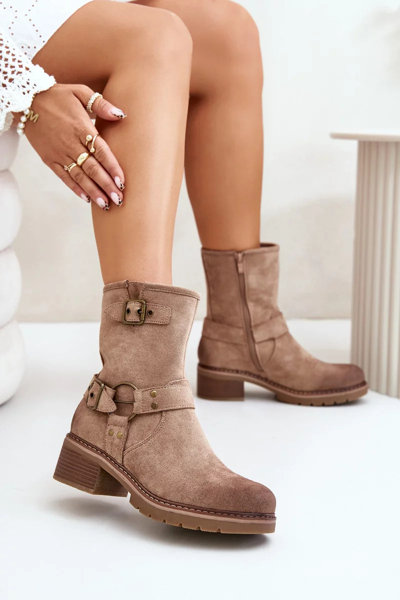 Zajímavé dámské kotníčkové boty hnědé na širokém podpatku