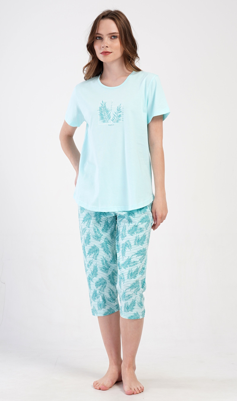 Dámské bavlněné kapri pyžamo značky Vienetta Secret. Dámské pyžamo se skládá z trička s krátkým rukávem a tříčtvrtečních kalhot. Tričko s kulatým výstřihem má na hrudi obrázek větvičky a drobný nápis. Motiv větviček se opakuje i na kalhotách, které mají v pase gumu a šňůrku na stažení, jsou bez kapes. Použitý bavlněný materiál je příjemný a poddajný na dotek. Materiál 100% bavlna