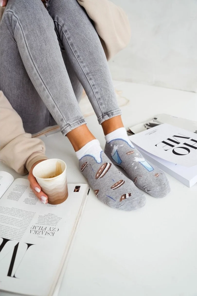 Sladké duo ve vašem šatníku! Dámské ponožky Milk and Cookies jsou dokonalou kombinací pohodlí a hravého designu. Jsou vyrobeny z měkké bavlny a poskytují pohodlí a prodyšnost po celý den. Roztomilý vzor mléka a sušenek dodává ponožkám jedinečný charakter a vnáší do každodenního stylingu nádech zábavy. Pružný materiál se dokonale přizpůsobí vašim nohám, aniž by při nošení tlačil nebo klouzal. Perfektně se hodí na cvičky, tenisky i domácí relaxaci! .