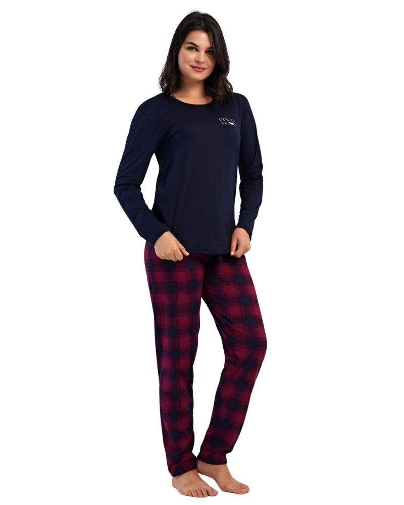 Dámské bavlněné dlouhé pyžamo Emma. Dámské pyžamo se skládá z trika s dlouhým rukávem a dlouhých kalhot. Jednobarevné triko s kulatým výstřihem zdobí na hrudi drobný nápis. Kárované kalhoty mají v pase gumu a šňůrku na stažení, nemají kapsy. Materiál 100% bavlna